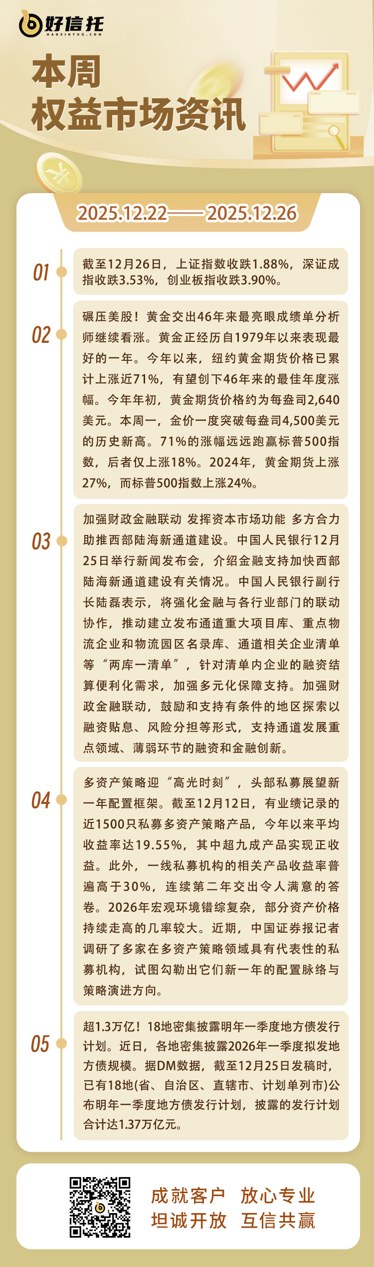 2、国金资管:2026年权益资产或将成配置主战场,债市将维持宽幅震荡。权益量化策略方面,国金资管表示,总体策略深度正不断提升。在市场波动、成交量逐步下行的大背景下,量化策略的超额收益表现,或将印证策略深度已实现新突破,因此该类策略明年仍具备一定配置价值。不过在配置结构上,需重点关注两点:一是在策略周期上适度分散;二是结合需求精准选择具体产品策略。债市展望方面,国金资管认为,2026年积极财政政策或持续发力,通胀预期有望逐步升温,叠加机构行为扰动加剧,债市利率下行空间或受到限制。但与此同时,央行大概率将维持流动性宽松以配合财政政策落地,政策工具箱仍有发力空间。综合来看,2026年债市收益率或将继续维持宽幅震荡行情。